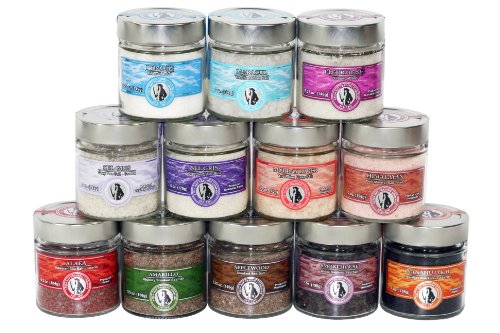 Our whole collection of gourmet salts! Contains Fleur de Sel French Sea Salt, Fine Grain Sel Gris French Sea Salt, Coarse Grain Sel Gris Frech Sea Salt, Himalayan Pink Mineral Sea Salt, Murray River Australian Flake Sea Salt, Coarse Grain Alaea Red Hawaiian Sea Salt, Coarse Grain Nanahu o Kai Black Hawaiian Sea Salt, Pyramis Kosher Flake Sea Salt, Marazul Coarse Grain Traditional Sea Salt, Applewood Smoked Sea Salt, Amarillo Hickory Smoked Sea Salt, and Smokehouse Coarse Grain Alder Smoked Sea Salt.